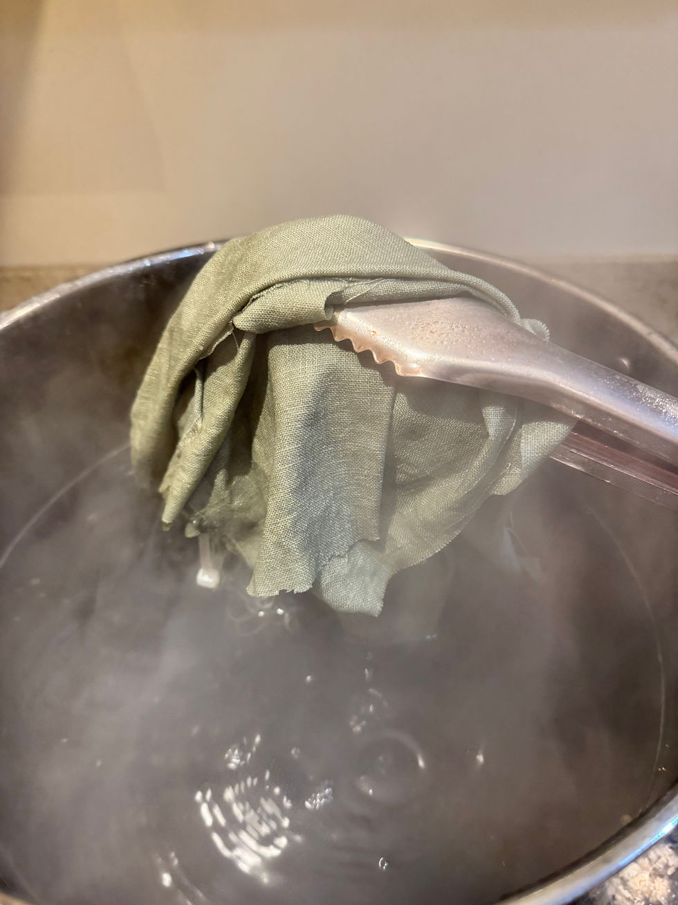 degrees. Linen can be heated to higher temps than wool, but I didn’t want to overheat the dye and cause it to turn brown. A 20 minute check on the fabric revealed a beautiful shade of blue-green. Always on a quest for shades of green, this was exciting! I continued the dye bath for a total of 1 hour, then removed and gently rinsed the fabric. For some natural dyes, it is beneficial to leave the fabric to sit in the dye bath overnight, but for this experiment I suspected the color would dull and did not. That can be a variable to experiment with another time.